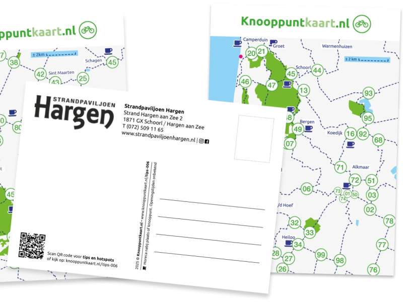 Leuk is dat de knooppuntkaarten echte ansichtkaarten zijn. Aan de andere zijde van het kaartje kun je een tekst schrijven, het adres van de ontvanger invullen en een postzegel plakken. Daarna hoef je hem alleen nog maar in de brievenbus te gooien als leuke verrassing.